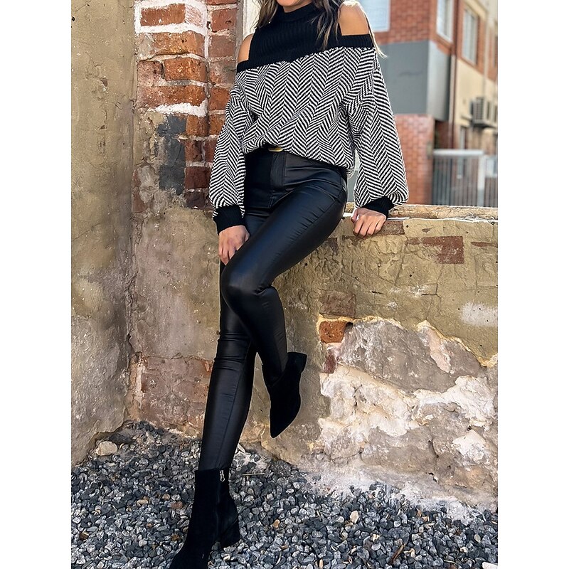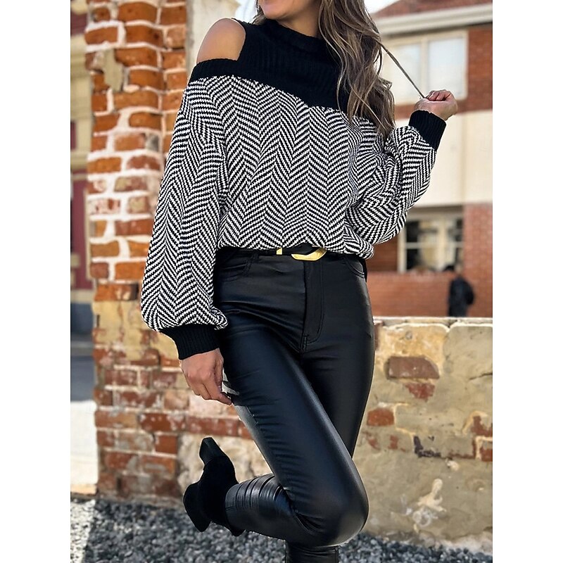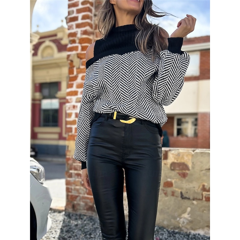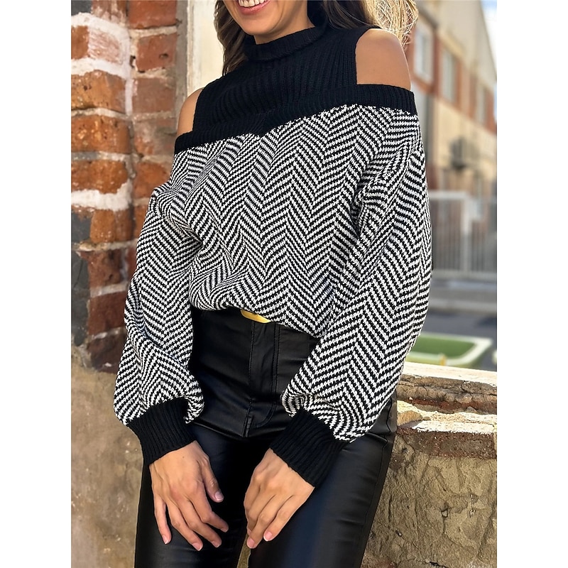 More information about Women's Sweater Pullover Sweater Jumper Casual velvety Geometric Ribbed Turtleneck Knitted Cold Shoulder Long Sleeve Regular Tops Knit Outdoor Daily Weekend Black Fall Winter