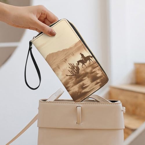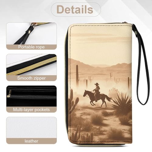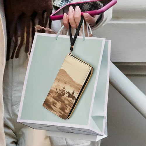 West Desert Riding Horses Leather Wallet Smooth Zip Around Clutch Wristlet Travel Long velvety Purse for Women