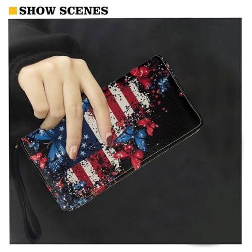American Flag Butterfly Wallets Long Purse for Women Leather RFID Blocking Credit Card Holder Clutch Bag