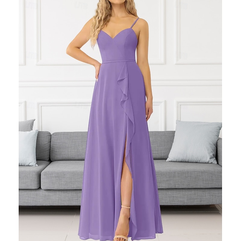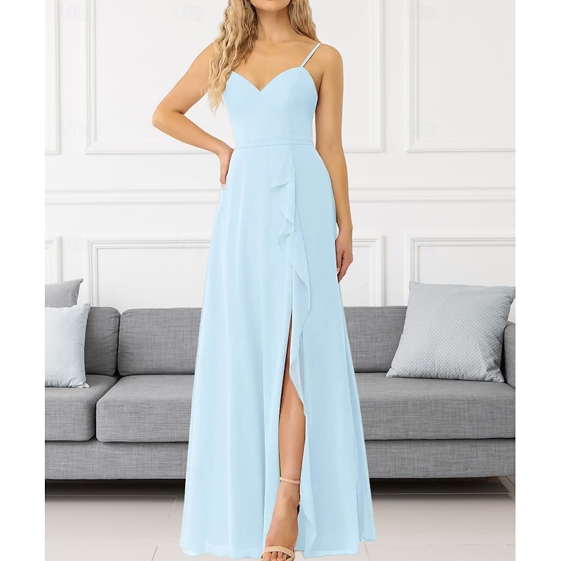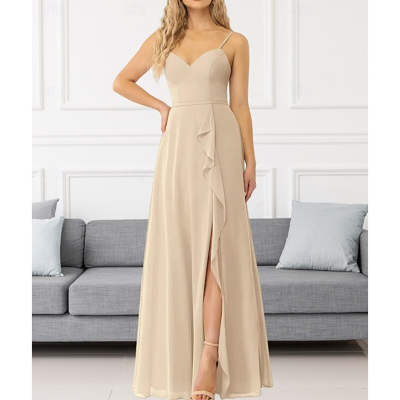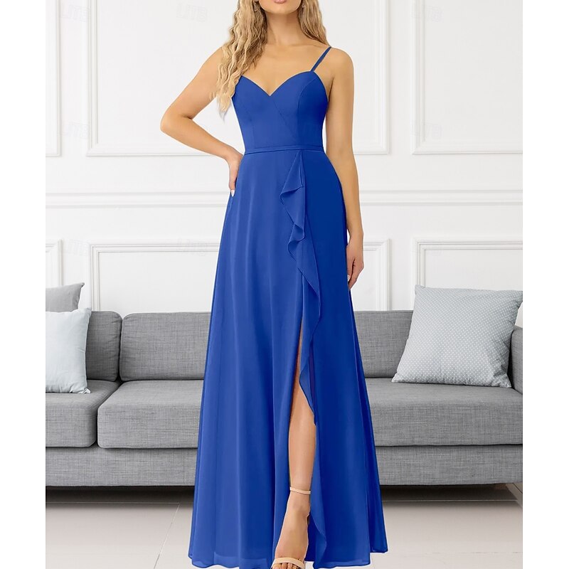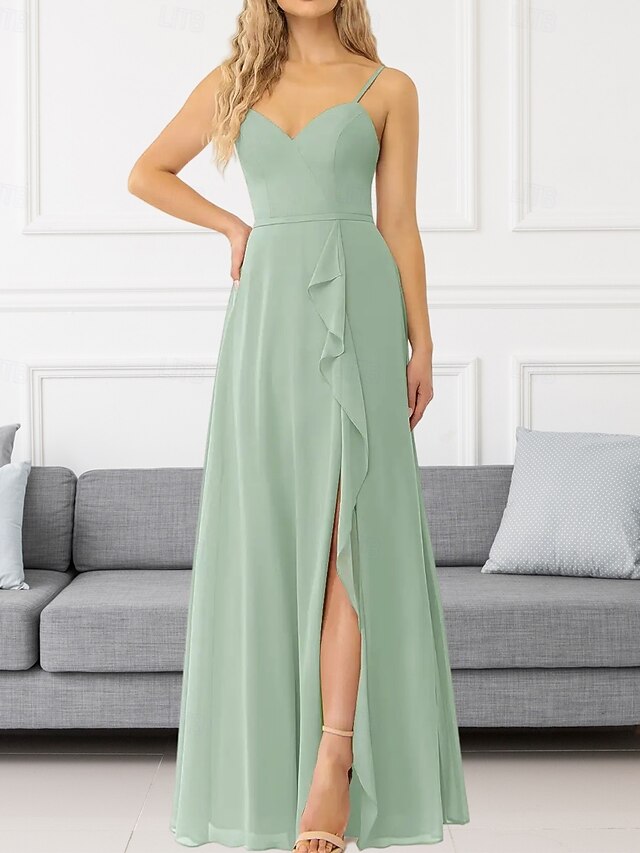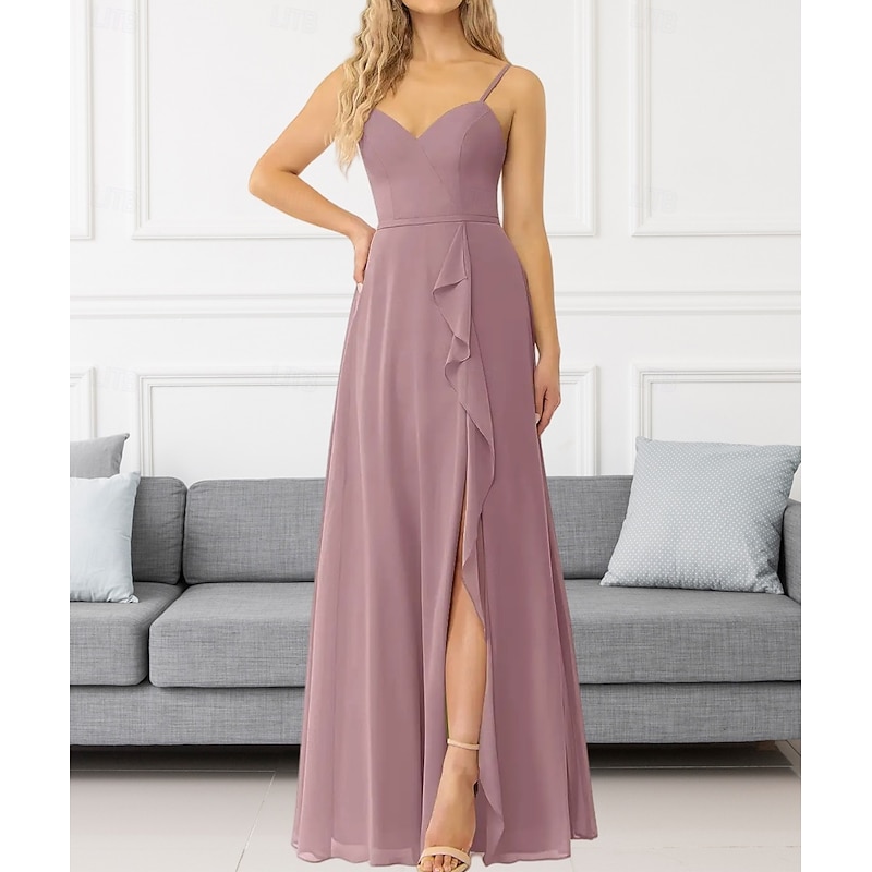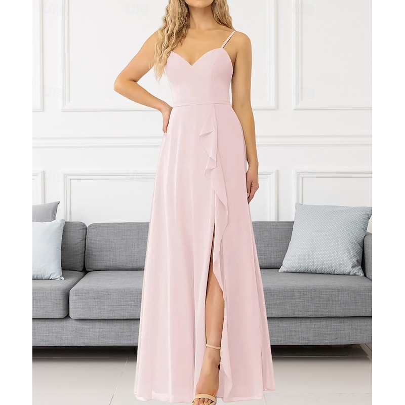 This A-Line Bridesmaid Dress V Neck / Spaghetti Strap Sleeveless Elegant Floor Length Chiffon with Ruffles / Split Front / Ruching 2022 combines elegant design with practical functionality. Every detail has been carefully considered to ensure you get the best possible experience. The remarkable construction means this product will serve you well for years to come.