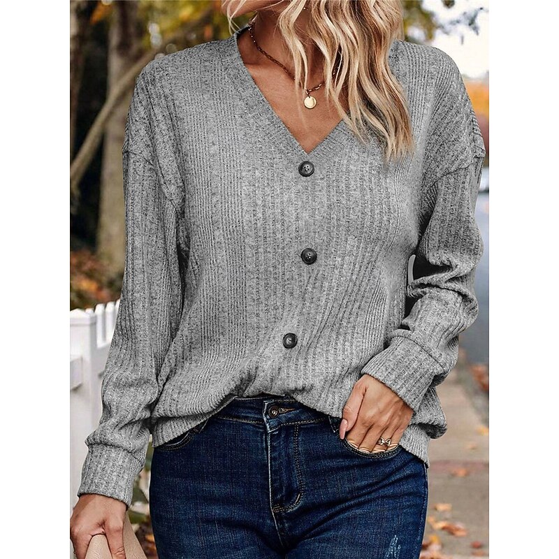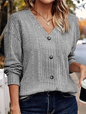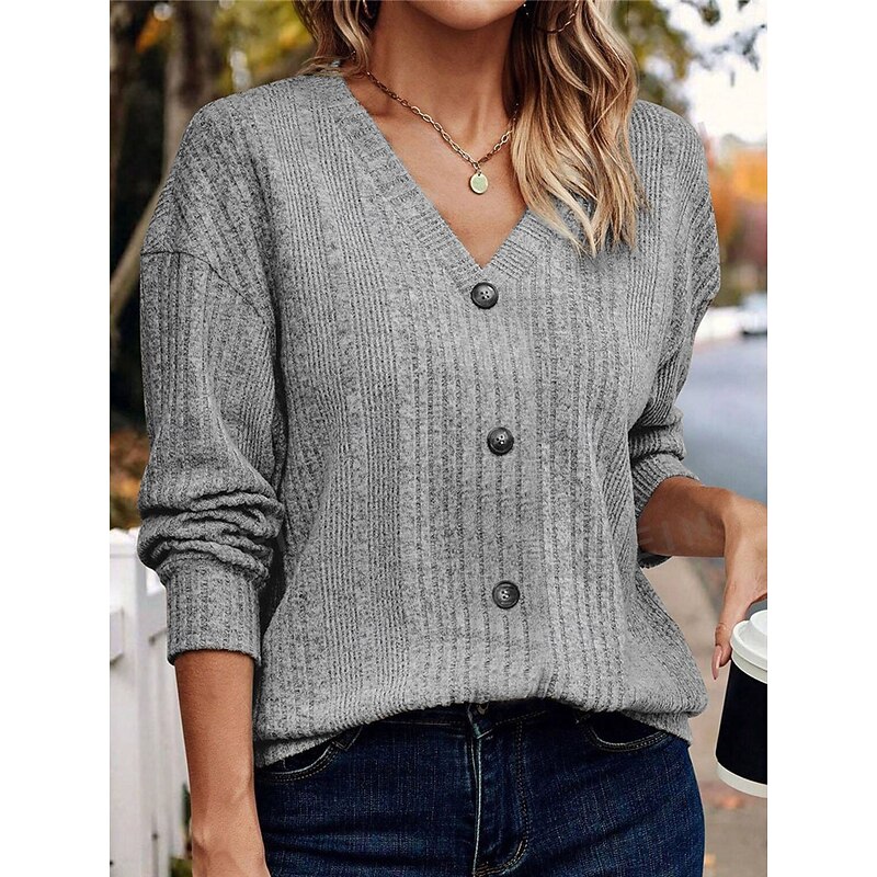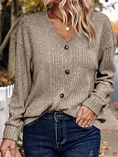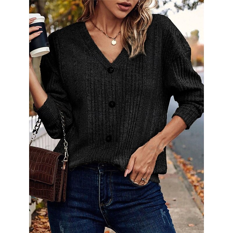 Highlights [Fabric] Crafted from high-quality polyester, this women's sweater features a soft, ribbed knit that ensures both comfort and warmth during the cooler seasons. The fabric provides a micro-elastic fit, allowing for ease of movement and layering. [Fit] The sweater has a regular fit with a V-neckline, complemented by long sleeves and a drop shoulder design. The relaxed silhouette adds to its casual yet sophisticated appeal, making it suitable for a variety of body types. [Design Highlights] This cardigan features a classic button-down front with dark, contrasting buttons that add a touch of elegance. The knitted texture enhances its cozy and trendy look, while the pure color options—black, gray, and khaki—allow for versatile styling. The ribbed knit pattern provides an added layer of detail, elevating the overall design. [Occasions] Perfect for daily wear, outdoor outings, weekends, and casual events. Whether you're dressing it down with jeans for a laid-back day out or layering it over a dress for a more polished appearance, this sweater effortlessly adapts to your style needs. [Size Range] Available in sizes S, M, L, and XL, this sweater accommodates a wide range of fits, ensuring comfort and style for everyone. Perfect for everyday use. excellent materials and excellent craftsmanship ensure long-lasting durability.