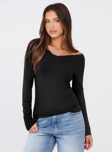 Fabric type: 92% Viscose 8% ElastaneCare instructions: Machine/Hand WashOrigin: ImportedNeck style: Off Shoulder Neck【COMFY & STRETCHY MATERIALS】:Comfy & elastic fabric,lightweight,breathable,skin-friendly. The fabric of this off the shoulder top is as soft as a cloud, you might forget you're wearing it.【TRENDY STYLE DESIGN】:Women Long Sleeve, Off the Shoulder, V Neck, Slim Fitted, Basic tops, off the shoulder tops for women. Backless, Trendy going out tops. It's so cute & elegant.【WOMENS FALL TOPS】:This Sexy off shoulder v-neck design accentuates the collarbone and elongates the neck, adding a touch of sophistication.【OCCASION】: Basic and fashion top, great for going out,running,gym,work out,yoga,daily wear, streetwear,party,club,date nigh,beach,travel,vacation,shopping,etc.【chic WEARING】:This a must-have T-shirt is simple design makes it highly versatile,perfect wear with cargo pants,shorts, jeans,skirt,cardigan,hoodie,sweater and jacket in spring,fall and winter, it can be styled to suit different looks. Perfect for everyday use. supreme materials and excellent craftsmanship ensure long-lasting durability.