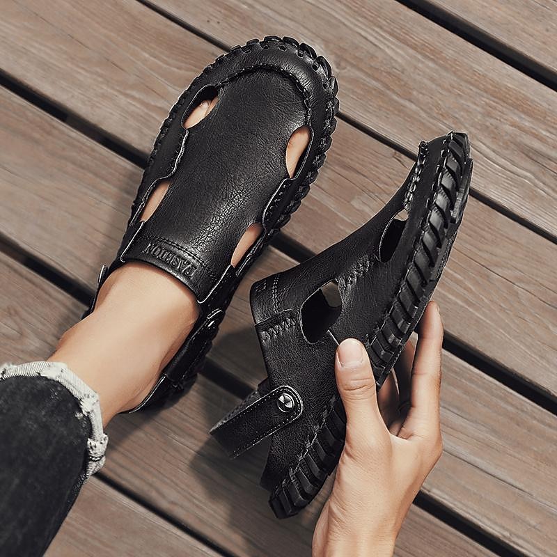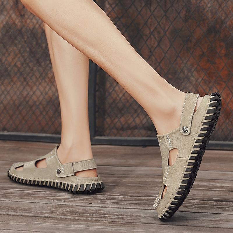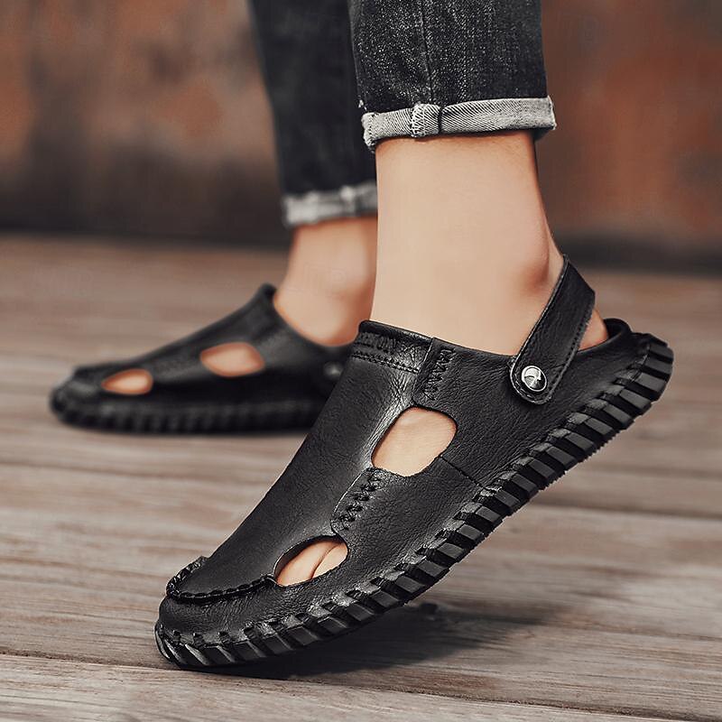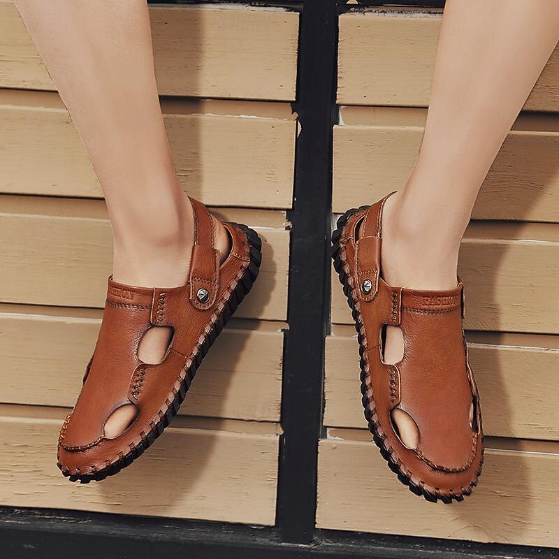 : The sandals feature meticulous stitching that enhances durability and visual appeal. The rugged rubber sole offers magnificent grip, suitable for diverse terrains, while the loafers' closure ensures hassle-free wear. The solid-colored design in shades of black, khaki, and red brown adds a timeless elegance.