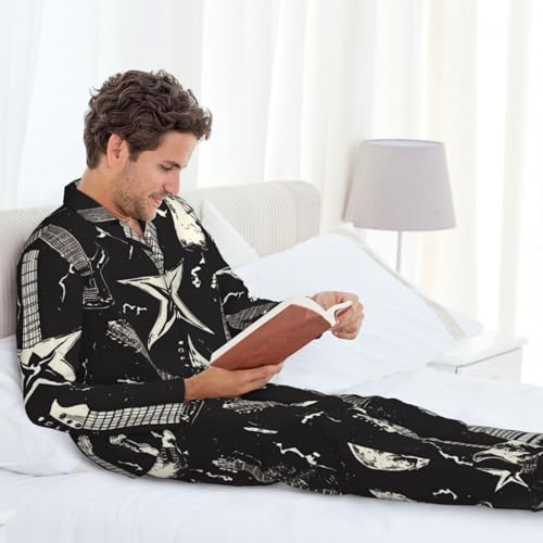 Rock Music Themed Mens Pajamas Set Button Down Sleepwear Set Long Sleeve Loungewear With Pockets
