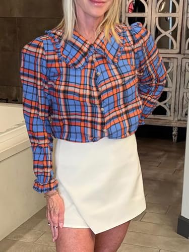 Tankaneo Womens Peter Pan Collar Button Down Shirts Long Sleeve Plaid Blouse Dressy Casual Fall Tops 4