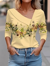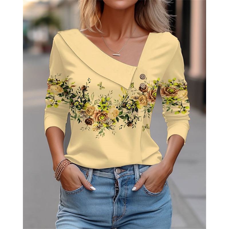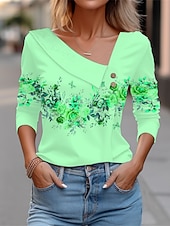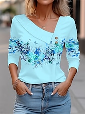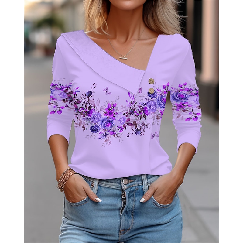 Highlights [Fabric] : Crafted from a blend of polyester, this structured women's T-shirt offers a micro-elastic fit for enhanced comfort during the fall and winter seasons. The fabric's softness and durability make it an everyday staple. [Fit] : The regular fit ensures a flattering silhouette that suits a range of body types, delivering both style and comfort for daily wear. [Design Highlights] : This elegant vintage-inspired top features a V-neckline and an asymmetrical button detailing on the left shoulder for a touch of sophistication. The sleeves are adorned with a vibrant floral print, adding a feminine and artistic flair. [Occasions] : Ideal for holidays, weekend outings, and casual gatherings, this versatile piece seamlessly transitions from day to night. Pair it effortlessly with jeans or skirts for a chic and put-together look suitable for both relaxed and semi-formal occasions. [Size Range] : Available in sizes S, M, L, XL, and 2XL to accommodate varying preferences and ensure a perfect fit for every individual. This T-shirt's versatile design and size options make it a perfect addition to your wardrobe. Perfect for everyday use. supreme materials and excellent craftsmanship ensure long-lasting durability.