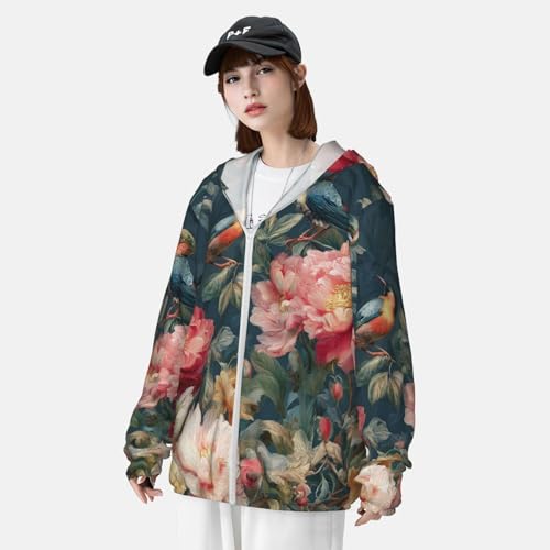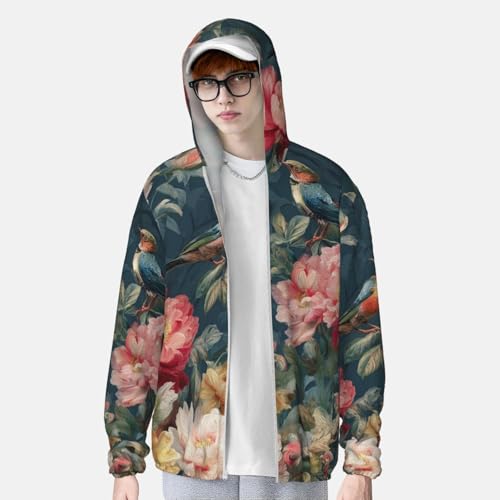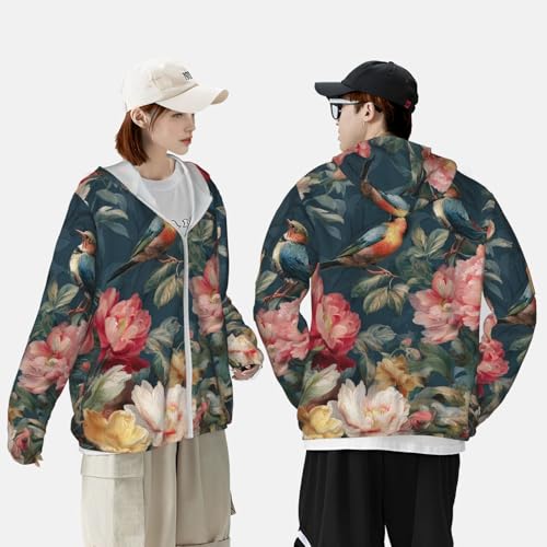 Sun Protection Hoodie Shirt Flowers Birds UPF 50+ Long Sleeve Outdoor Rash Guard for Men Women