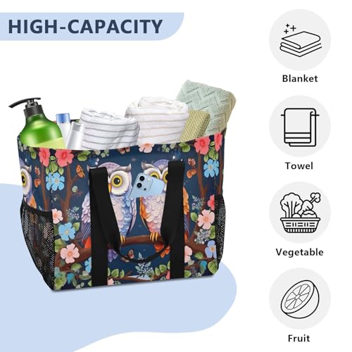 Owls on Floral Branch Large Beach Bag Waterproof Beach Tote Bags for Women Travel Gym Pool