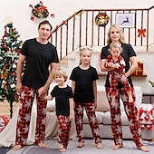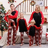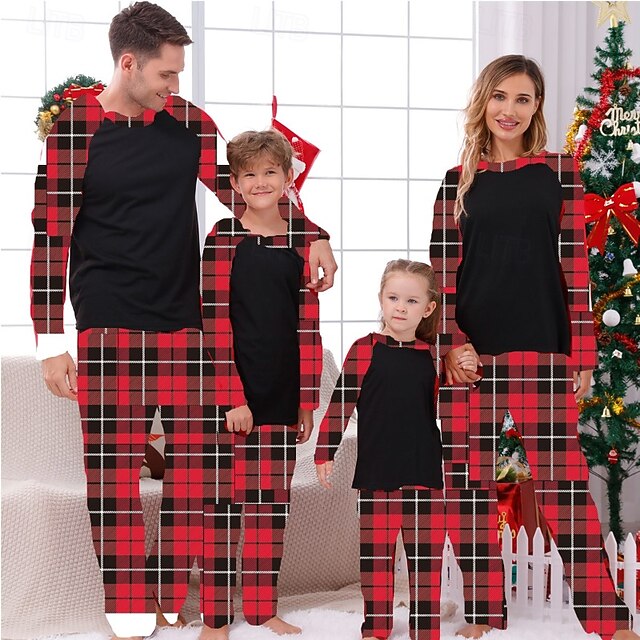 HOT ! Family Pajamas Plaid Christmas Pattern Home Print Black Dark Red Wine Long Sleeve Active Matching Outfits