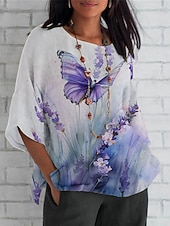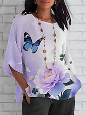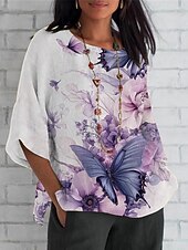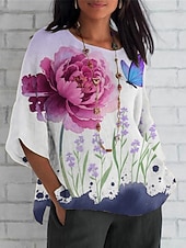 must-have ! Women's Shirt Floral Daily Casual 3/4 Length Sleeve Crew Neck Regular Tops Daily Holiday Print White Light Purple Purple Violet Summer Spring Fall