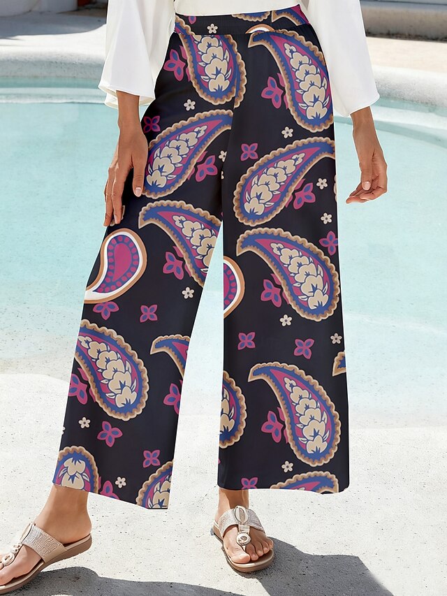 Why Choose Women's Pants Smooth Satin Purple Paisley Print Elastic Waist Pleated Loose Straight Wide Leg?