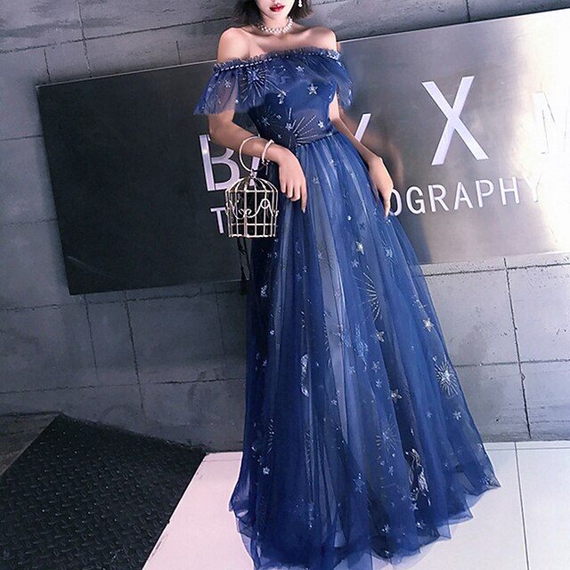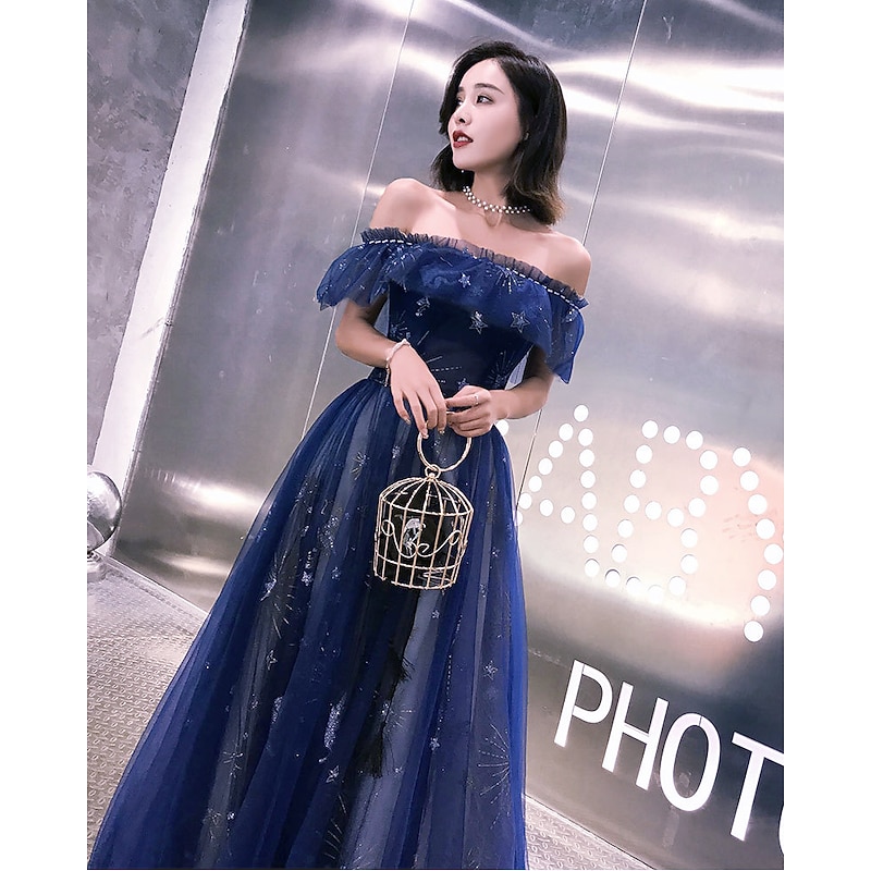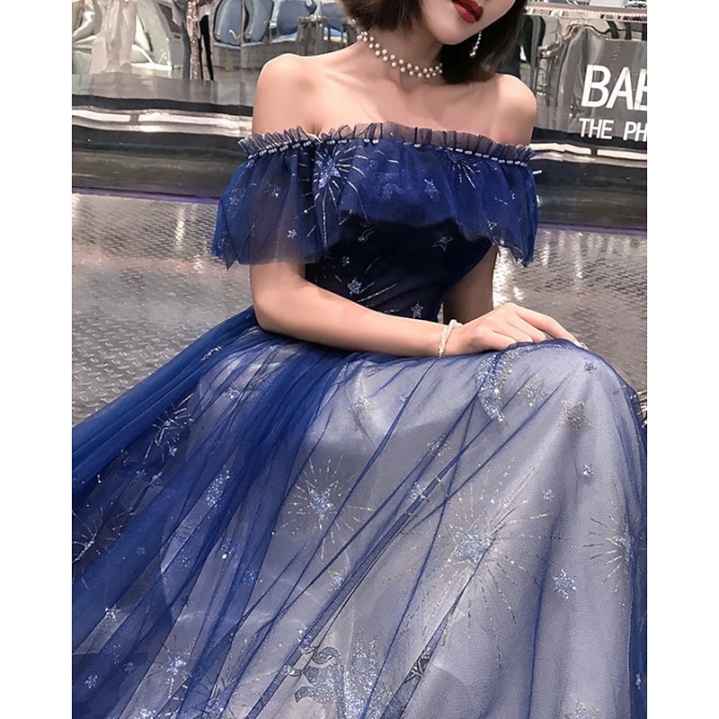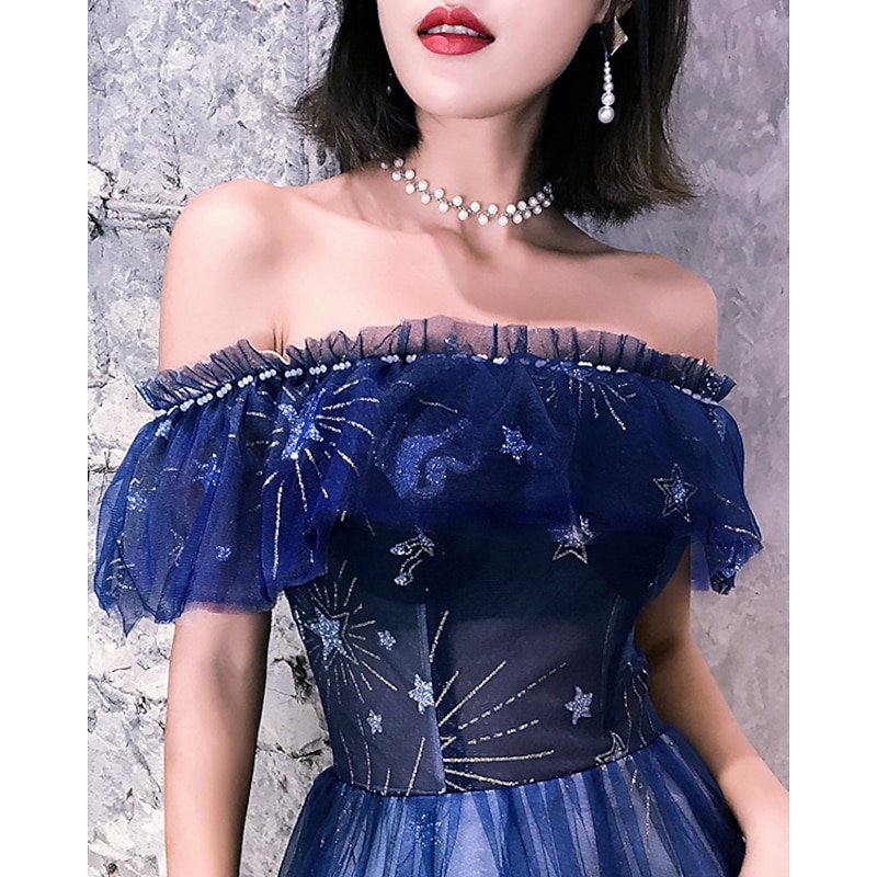 Highlights [Fabric] : Crafted from luxurious tulle, this exquisite dress features intricate embroidery and tiered detailing, offering a dreamy and ethereal appearance. The fabric's rich dark navy hue is enhanced with subtle shine, creating a captivating and elegant look for any occasion. [Silhouette] : The classic A-line silhouette of this floor-length gown is designed to flatter various body types, with a lace-up closure ensuring a perfect fit. The gown's built-in bra and boning provide additional support and shape, accentuating the figure gracefully. [Design Highlights] : This elegant dress boasts an off-shoulder neckline with cold shoulder short sleeves, adorned with delicate ruffled details for a modern yet sophisticated flair. The flowing skirt cascades beautifully to the floor, while the structured bodice highlights an enchanting star motif for a celestial touch. [Occasions] : Ideal for formal evenings, engagement parties, weddings, and other special occasions, this gown promises to make you stand out with its sparkle and shine. Whether attending as a wedding guest or enjoying an elegant evening event, this dress adds charm and sophistication. [Size Range] : Available in a wide range of sizes from US 0 / UK 2 / EU 30 to US 26W / UK 30 / EU 56, this dress caters to a variety of body shapes and ensures a stunning fit for every wearer. Please note that colors may slightly vary due to monitor settings, and professional dry cleaning is recommended to maintain the dress's quality. Perfect for everyday use. finest materials and excellent craftsmanship ensure long-lasting durability.