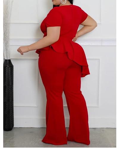 Fabric type: 95% Polyester, 5% SpandexOrigin: ImportedFeatures: great plus size peplum tops with pants features scroop round crew neck, short sleeve, back zipper, asymmetrical tunics hem, peplum tops, dressy long pants, great stretchy suits, the pants is in wide leg. A great casual plus size suits sets for women business for your choice!Soft and comfy fabric: womens plus size pants suits 2 piece set for curvy women made by stretchable fabric, soft,and comfortable. delicate cut added a sense of fashion but elegant; red plus size outfits pants suit for women, plus size white pants suit outfit for curvy plus size women, plus size white jumpsuit 5x,plus size women pants suits,plus size two piece sets for womenOccasions: plus size 2 piece outfit casual solid peplum tops and pant suits set suitable for cocktail party, evening event, night club, office, wear to work, wedding or any special occasions; blue pants suit for women plus size / black 2 piece outfit women funeral plus size / red pants suit for women / white pants suit for women plus sizeSeasions: plus size two pieces set casual pants suits outfits are a must have this year for women, plus size 2 piece pants and peplum tops for chic and chic look.plus size black formal pants suits for curvy women short sleeves evening party elegant, women plus size jumpsuits dressy casualThis solid irregular peplum tops and pants set is stretchy. The pants feature a high waist with an elastic waistband, ensuring comfort and a flattering fit for plus-size wearer; wide, straight-leg cut, combining comfort and elegance for a sophisticated, modern look. Perfect for everyday use. finest materials and excellent craftsmanship ensure long-lasting durability.