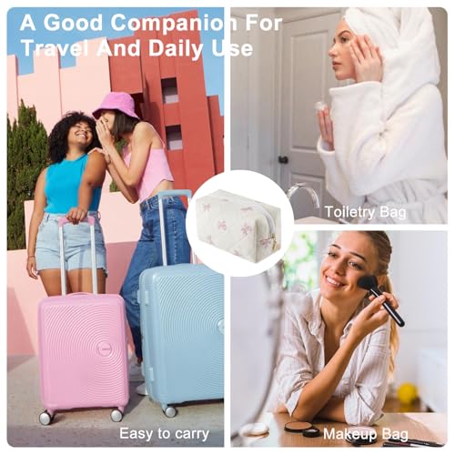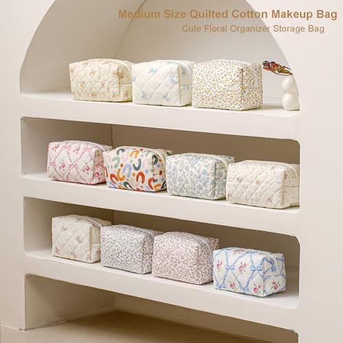 Gleyemor Small Quilted Makeup Bag for Women, Cute Floral Bow Cosmetic Bag, Emergency Bag Travel Toiletry Cotton Pouch Gifts for Girls Her Mom Friend Sister Bridesmaid (Small Pink Bowknot)