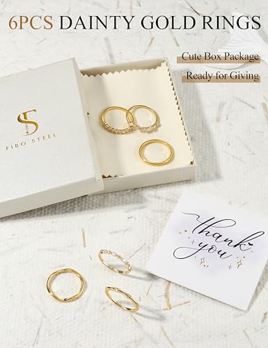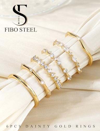 Ring size: 5Material: MetalMetal type: Gold plated brassGem type: Cubic ZirconiaItem type name: Stackable RingsStackable Rings for Women: Each gold ring set includes 6 different designs of rings. Cubic zirconia rings are shiny and dazzling, plain ring is enduring and all-match, and wave ring has personalized style. These stackable rings suit various styles of womenGold Rings Non Tarnish: 14K gold Filled surface ensures our womens rings hypoallergenic, non tarnish and waterproof. Even in a shower, the ring won't turn your finger green. Besides, the cubic zirconia is inlaid firmly with a realistic sparkle, not easy to fall outComfortable to Wear: Our thumb rings have highly polished smooth surface, so don't worry about scratching your hand. The ring set is lightweight and runs true to size, comfort to everyday wear. Make these knuckle rings an addition to any outfit you wearAvailable in Multiple Sizes: Our dainty rings for women are available in size 5 to 10, the size is suitable for most people. These chunky rings can be worn separately or stacked according to your preference. Measure your finger and choose the right sizePerfect Present: The gold ring set is suitable for most occasions or festivals. It's ideal present for yourself, mom, wife or friends on wedding, birthday, anniversary, party, Christmas or Mother's Day. Express them your love with the women rings Perfect for everyday use. finest materials and excellent craftsmanship ensure long-lasting durability.
