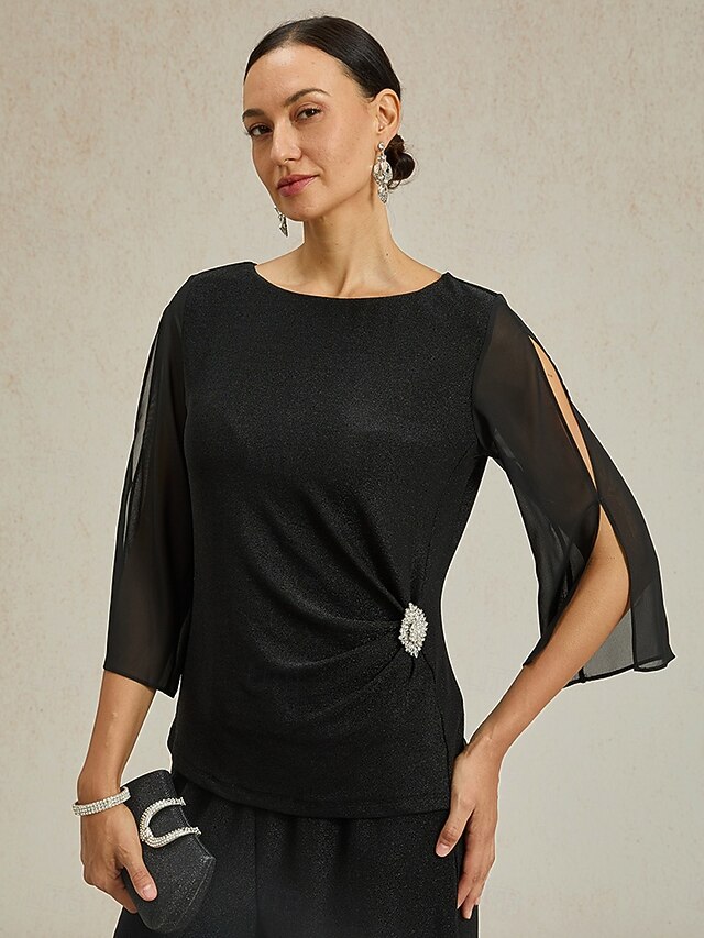 Women's Dressy Tops Solid Color Elegant Vintage Daily 3/4 Length Sleeve Crew Neck Regular Tops Wedding Guest Evening Party Date Night Outfits Glitter Black Spring, Fall, Winter, Summer 2