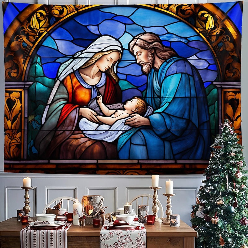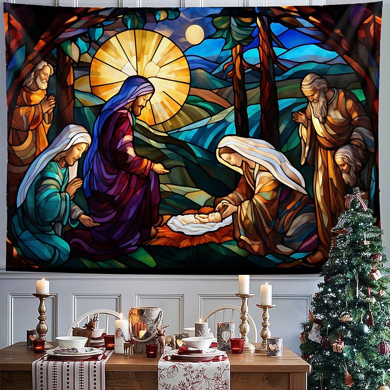 Christmas Decorations Nativity Scene Hanging Tapestry Stained Glass Wall Art Xmas Large Tapestry Mural Decor Photograph Backdrop Blanket Curtain Home Bedroom Living Room Decoration