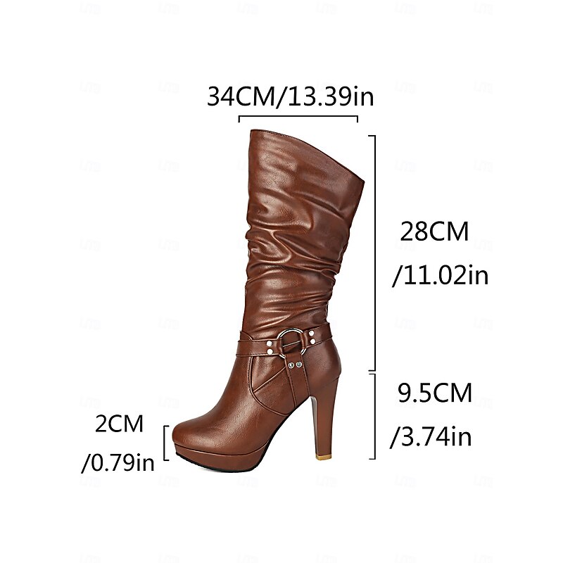 must-have ! Women's Brown Faux Leather Platform Slouch Boots with Stiletto Heel and Belt Buckle - Retro Fall Winter Booties for Parties, Dates and Daily Wear