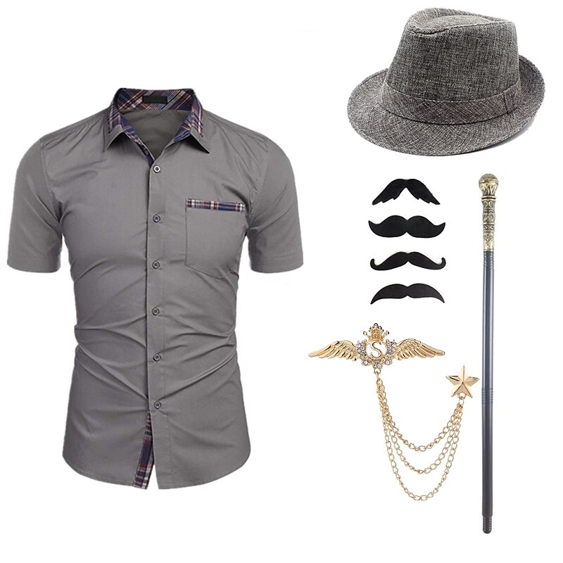 Mens 1920s Gangster Shirt with Accessories Set the Great Gatsby Retro Vintage Cosplay Costume Hat Beard Brooch Cane 10