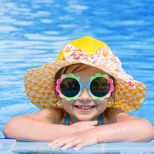 • Cute Design: The toddler girls round flower glasses is designed with round flowers shape frame and mirror lens, candy color cute sunglasses for baby kids.