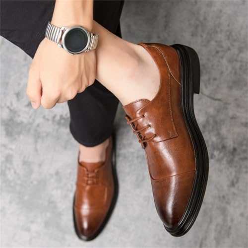 Sole material: RubberOuter material: LeatherClosure type: Lace-UpWater resistance level: WaterproofThese men's Oxford dress shoes embody the timeless charm of British fashion. The lace-up front adds a touch of elegance, while the pointed toe design enhances the overall sleek look. Perfect for business meetings, formal weddings, or office work, they help you make a sophisticated statement wherever you go.Featuring a low chunky heel, these shoes provide excellent stability and support. You can walk confidently for long hours without feeling tired. The heel height is carefully designed to balance style and comfort, making them ideal for daily wear in various formal settings.Safety is a top priority, and these shoes come with a non-slip outsole. Whether you're walking on wet or slippery surfaces, you can trust these shoes to keep you steady. This feature makes them suitable for different environments, from office hallways to wedding venues.As a type of Derby shoes, they offer versatility in styling. You can pair them with a suit for a formal business look or with a tuxedo for a wedding. Their traditional design allows for easy matching with different outfits, making them a practical choice for your wardrobe.From business formal events to office work and weddings, these shoes are the perfect fit. Their elegant appearance and comfortable design make them suitable for a wide range of occasions. You don't need to worry about finding the right shoes for different events; these ones have got you covered. Perfect for everyday use. excellent materials and excellent craftsmanship ensure long-lasting durability.