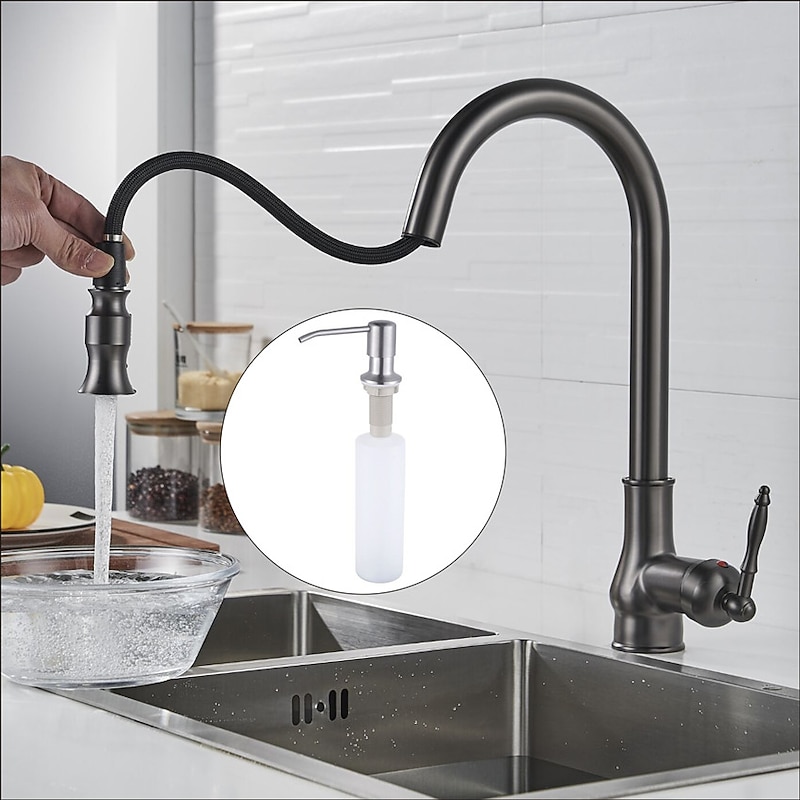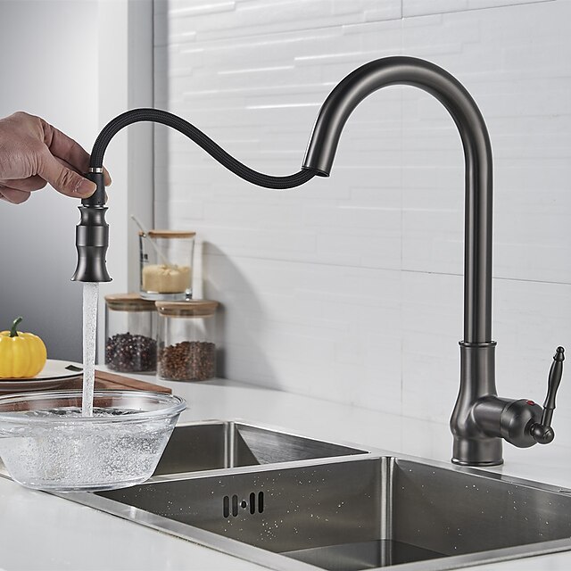 More information about Kitchen Sink Mixer Faucet with Pull Out Sprayer Grey, 360 Swivel Single Handle Spring Kitchen Taps Deck Mounted, One Hole Brass Kitchen Sink Faucet Water Vessel Taps