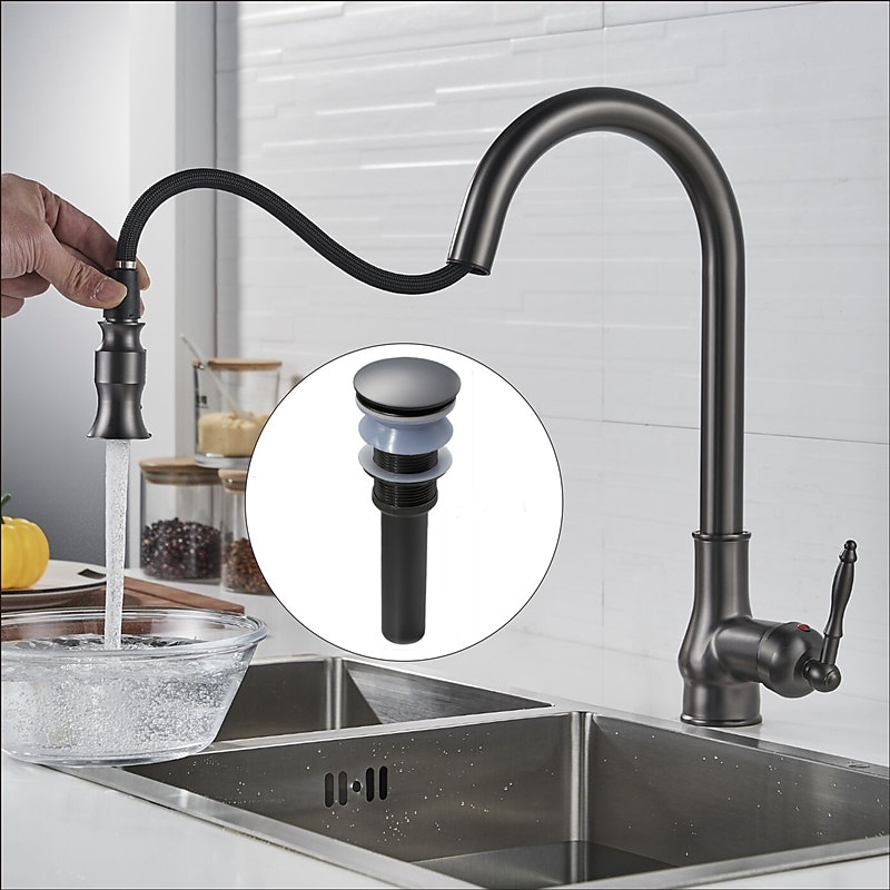 Kitchen Sink Mixer Faucet with Pull Out Sprayer Grey, 360 Swivel Single Handle Spring Kitchen Taps Deck Mounted, One Hole Brass Kitchen Sink Faucet Water Vessel Taps