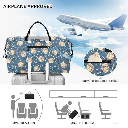 Blue Baseball Star Retro Large Travel Duffle Bag Weekender Overnight Bags Gym Yoga Bag for Women Men with Toiletry Bag 6