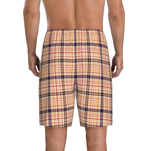 Mens Pajama Shorts, Retro Beige Plaid Print Lounge Pj Sleep Shorts for Men Sleepwear, Pajama Bottoms