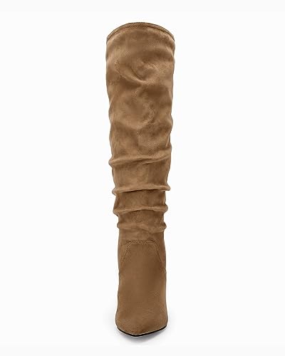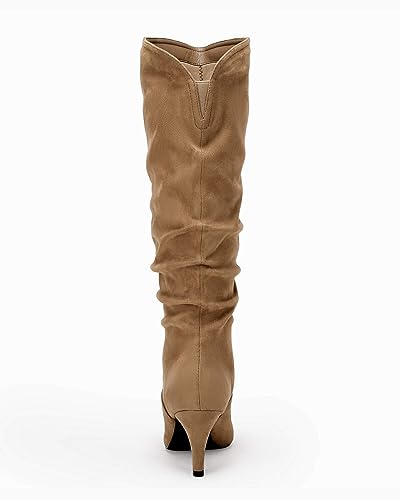 Coutgo Womens Slouchy Knee High Boots Wide Calf Kitten Heel Pointed Toe Pull On Long Boots Winter Shoes