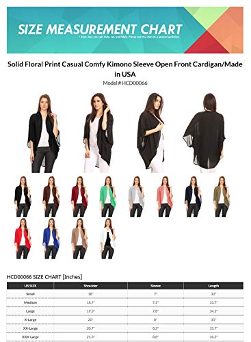 • HCD00066: Solid, long body cardigan in a loose fit with an open front, 3/4 length kimono sleeves, and hi-low hem.