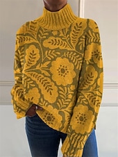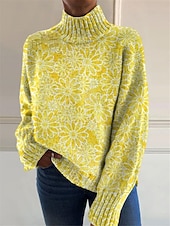 Women's Sweater Casual velvety Floral Ribbed Turtleneck Knitted Long Sleeve Regular Tops Knit Outdoor Daily Weekend Yellow Blue Fall Winter
