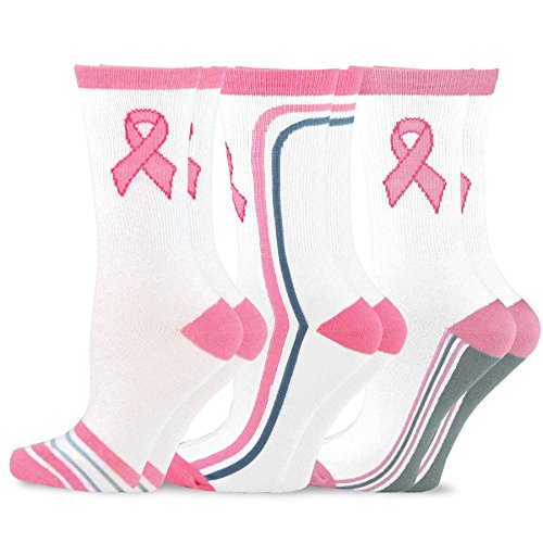 Fabric type: Cotton BlendCare instructions: Machine WashOrigin: ImportedFit type: Regular- Novelty Pink Ribbon Breast Cancer Crew Socks 3 Pairs: these meaningful breast cancer awareness socks are made of cotton, polyester, and spandex, with fine stitching, reliable and skin-friendly, soft and pleasant, breathable, and sweat absorbent. It could be cheerleading socks or team sports socks.- Gifts for her: Breast cancer socks are great gifts for women to encourage and hope for a cure. Give these breast cancer awareness dress socks to your loved one, family, friends, neighbors, and relatives. Show your love, support, and encouragement to fight cancer. Pink ribbon on black knee high socks, grey stripe and pink ribbon socks.- Treat yourself or a loved one with these pink ribbon breast cancer awareness socks. Socks come neatly packaged inside, so wrapping is made easy. Seasonal for October breast cancer awareness month. Novelty Socks for women with gift box for 12 pairs crew and 9 pairs knee high socks.- Stay cool with these lightweight thin socks. Try breast cancer awareness knee high socks and crew socks are perfect for wearing with a wide variety of ensembles ranging from sneakers to boots, shorts to jeans, and much more. Contents: 73% Cotton, 24% Polyester, 3% Spandex.- Try for team support, cheerleading, or any other occasion. Affordable prices. Great for donation. Sizing Guidelines: Medium-Women's Sock Size 9-11 (US Shoe Sizes 6-9). Fit may vary by individual. Please note that some socks are less stretched because of too many patterns on them. Machine washable. Perfect for everyday use. finest materials and excellent craftsmanship ensure long-lasting durability.