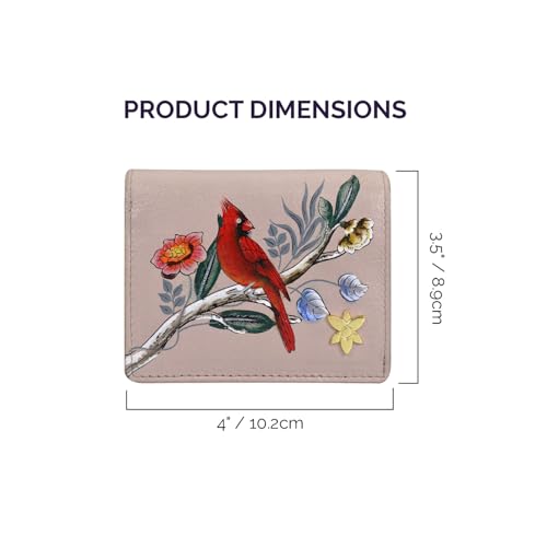 Care instructions: Keep away from direct sunlight. Avoid contact with water and other liquids. Condition with leather conditioner periodically.HAND-PAINTED LEATHER WALLETS FOR WOMEN - A handcrafted original art piece that is actually hand-painted onto gentle leather (not printed) to ensure each piece is pristine to bring a luxury feel organizer with flair and style you can flauntCARDINAL FAMILY ARTWORK - Each wallet is hand-painted to create a piece of art inspired by nature and vintage themes. As a family of magnificent cardinals perches on a sturdy branch, their vibrant plumage a striking testament to their majestyHANDCRAFTED FROM LEATHER - Our products are made in India from 100% genuine cowhide full-grain leather, which boasts a soft and luxurious feel. Each piece is cut by hand and handpainted, providing a personal touch and quality that will last a lifetimeFUNCTIONAL DESIGN - Designed for both beauty and form, each wallet features a snap button entry, a single billfold, a credit card holder, a business card holder, an ID Window, a receipt pocket, and a rear slip pocketDIMENSIONS - Width: 4 / 10.2cm, Height: 3.5 / 8.9cm Perfect for everyday use. supreme materials and excellent craftsmanship ensure long-lasting durability.