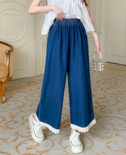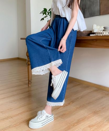 chouyatou Women's Casual Elastic Waist Denim Pants Lace Eyelet Hem Wide Leg Jean Capris Palazzo Culottes with Pockets