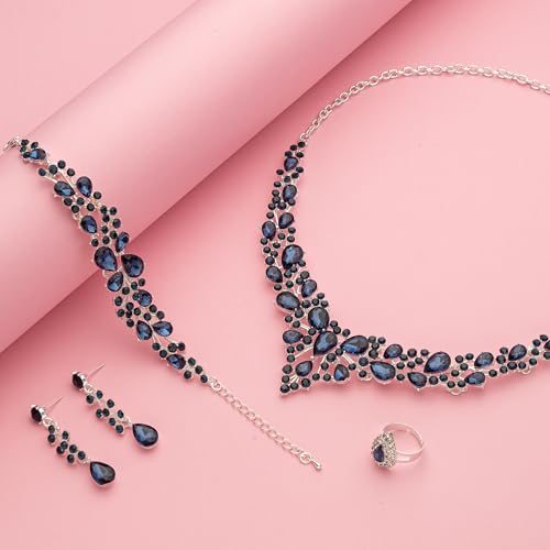 Crystal Bridal Wedding Jewelry Sets for Women Rhinestone Teardrop Crystal Statement Choker Necklace Drop Earrings Link Bracelets Rings Teardrop Jewelry Set for Brides Bridesmaids